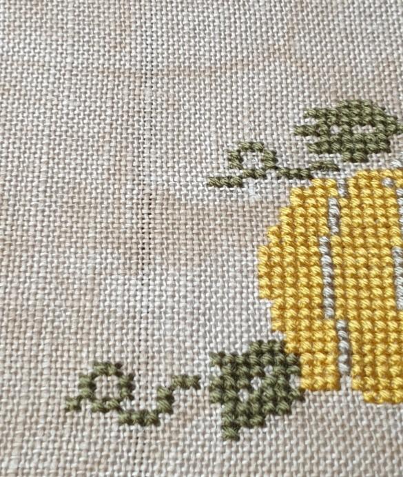 Elle mesure 132 x 59 points. Brodée sur la toile préconisée par la créatrice (Zweigart Belfast Vintage Country Mocha 3009 - 12,6 fils), la broderie mesure environ 21 x 10 cm.